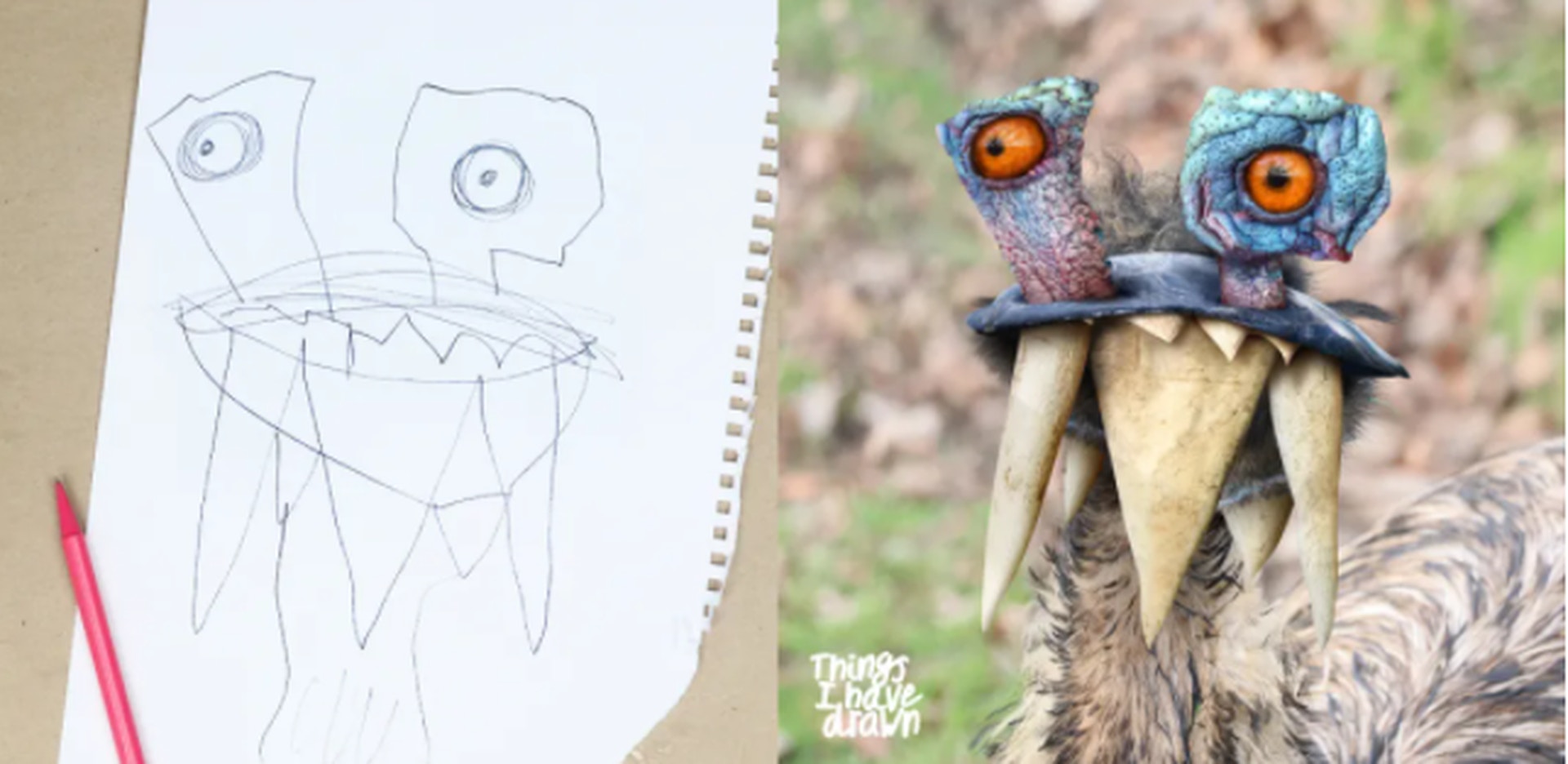 一般情況下,這些畫大家也就圖個樂,看看笑笑就過去了。但是老爸Tom不是一般人。在他看來,孩子們的這些畫反倒天真好玩又極具創造力。他甚至想過:如果孩子們筆下的東西變成現實會怎樣?眼睛鼻子都長在臉的一側的生物出現在現實生活中,你敢想?反正老爸Tom敢想!