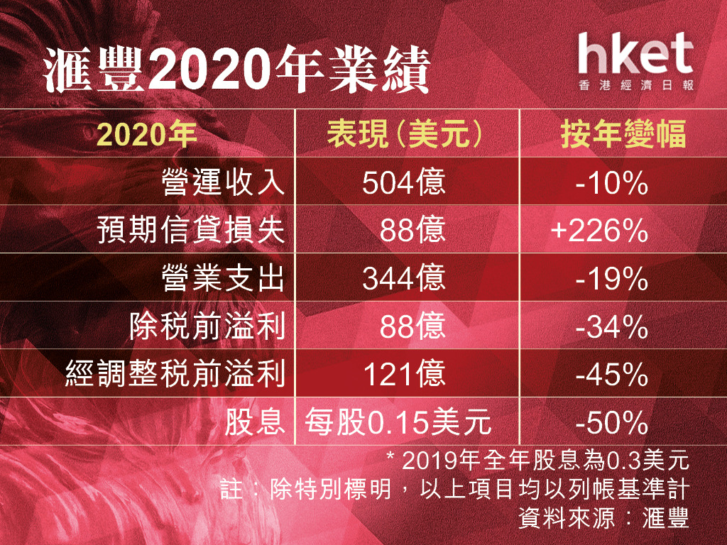 HSBC滙豐 (00005) 雖然重啟派息,惟去年盈利受疫情、淨息差受壓影響,列帳稅前盈利減少34%。滙豐在業績交代,去年全球員工可變收入的「花紅池」26.59億美元,按年少20.4%,「炒房」環球銀行和資本市場、資產管理和私人銀行影響較少,而滙豐亞洲員工也因「戰略重要和對集團持續貢獻」而影響較少。