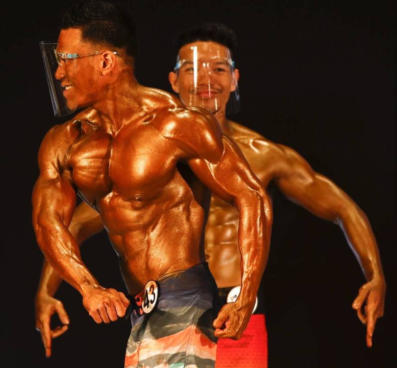 2021年泰國先生健美比賽9日在曼谷舉行,參賽者展示健壯的肌肉時戴防護面罩,作好防疫措施。(歐新社)