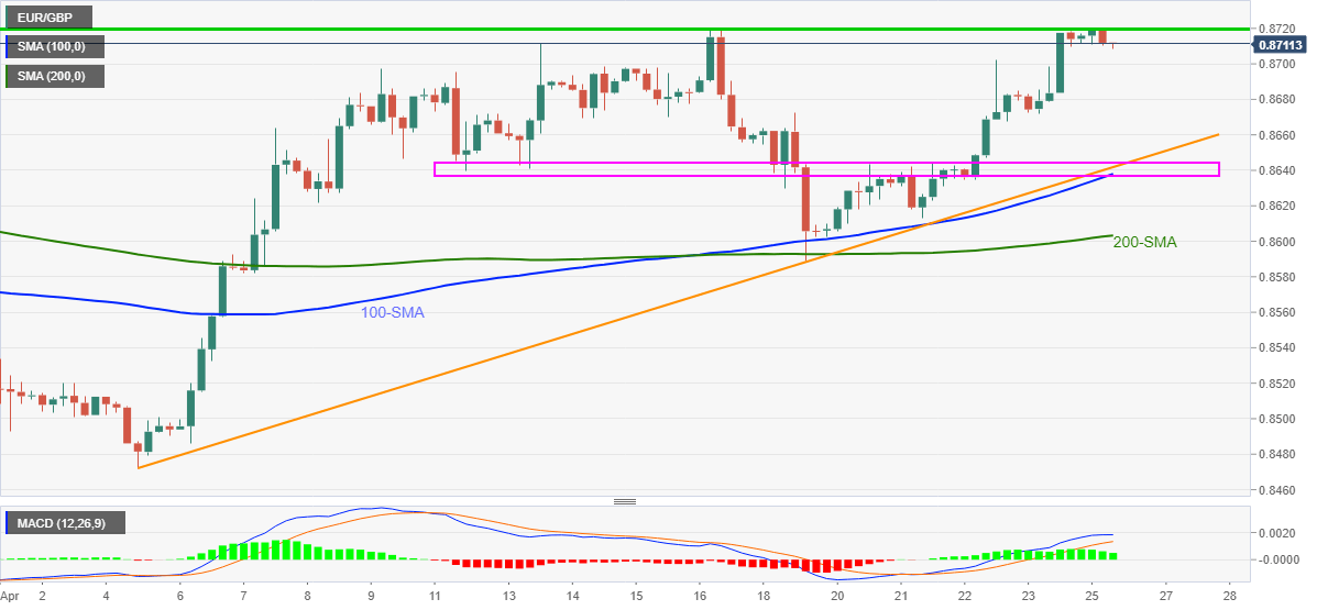 由於MACD回落且未能刷新月度高點表明匯價將進一步跌向0.8675的短期支撐,包括4月12日以來多重水平、100SMA和自4月5日以來的上行趨勢線0.8635-45,這是關注的關鍵水平。