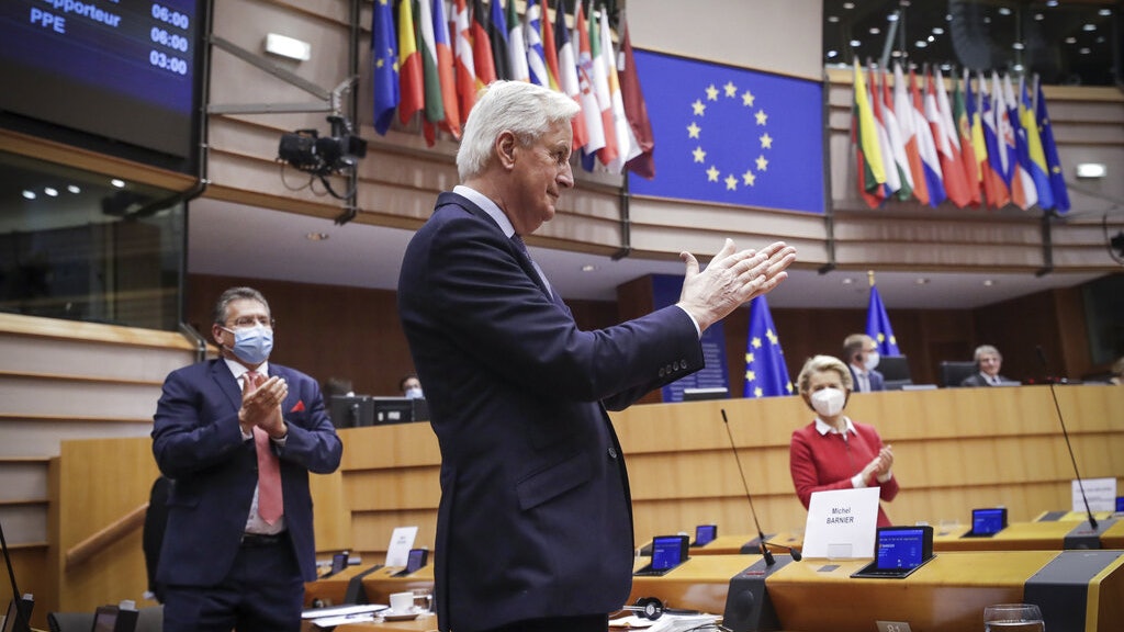 圖為歐盟負責英國脫歐事務的首席談判代表巴尼耶(左)與歐盟委員會主席馮德萊恩(右)4月27日在布魯塞爾出席歐洲議會會議(AP)