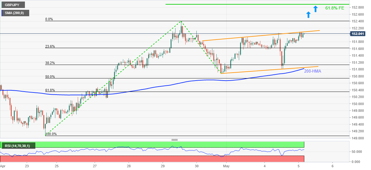 繼周一匯價回調至151.01後,需要突破152.40,然後進一步上行目標處在4月23日至29日昇勢和61.8%斐波位152.90附近,然後是上個月高位153.40附近。