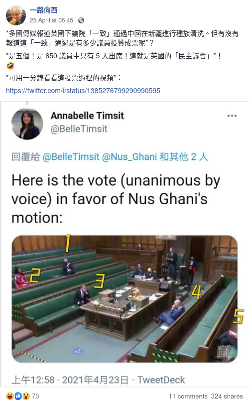 英國下議院通過無約束力議案,指中國在新疆對當地維吾爾族人及種族或宗教上的少數進行種族滅絕,以及犯下反人類罪行。翻查辯論的文字及影片記錄,當日有21位來自不同政黨的議員發言。Facebook專頁「一路向西」、專欄作家屈穎妍宣稱議案只有5位議員出席辯論及投贊成票,屬錯誤訊息。