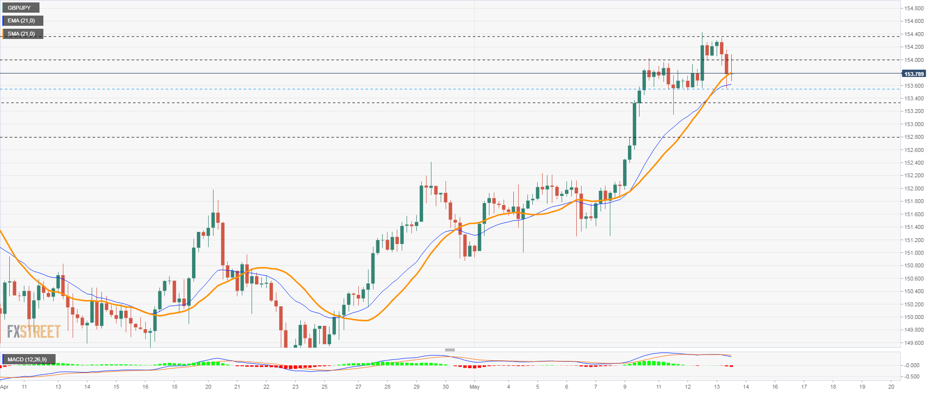 英鎊兌日元達到了多年來的最高水平154.44,之後有所回落。到目前為止,下行修正延伸到153.50區域的水平支撐位,以及4小時圖表中的20簡單移動均線。