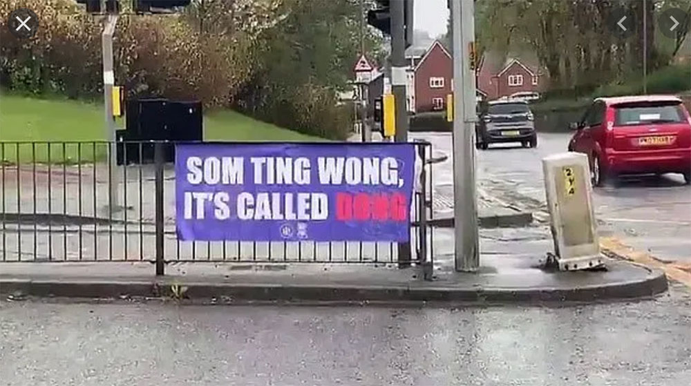 事實上,上圖其實是一張改圖,原圖其實是Som Ting Wong It’s Called DONG(下圖)。當時布力般流浪球迷,不滿大陸班主CEO任軒冬Xuandong Ren的管理而掛上的橫額。有關報道於5月8日時在英國部份傳媒網站出現,負責製作和公開展示的Blues Collective支援小組,否認橫額有種族歧視意思。唯不少布力般流浪球迷都有表態,指布力般流浪球迷有來自不同種族,這樣歧視無法接受,相當令人嘔心。有人則指,雖然很想任軒冬下台,但採取種族歧視方法無法接受。