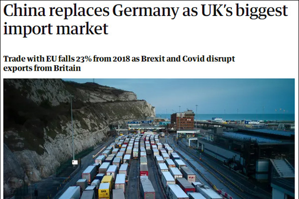 《衛報》報道稱,去年,中國是首個從疫情中恢復的大國,也是唯一一個實現全球貿易增長的大國,對華貿易增加的部分原因在於英國對進口自中國用於口罩和個人防護裝備(PPE)的紡織品的需求。英國因疫情封鎖期間,英國對中國電器產品的需求增加,也促使進口額增長。