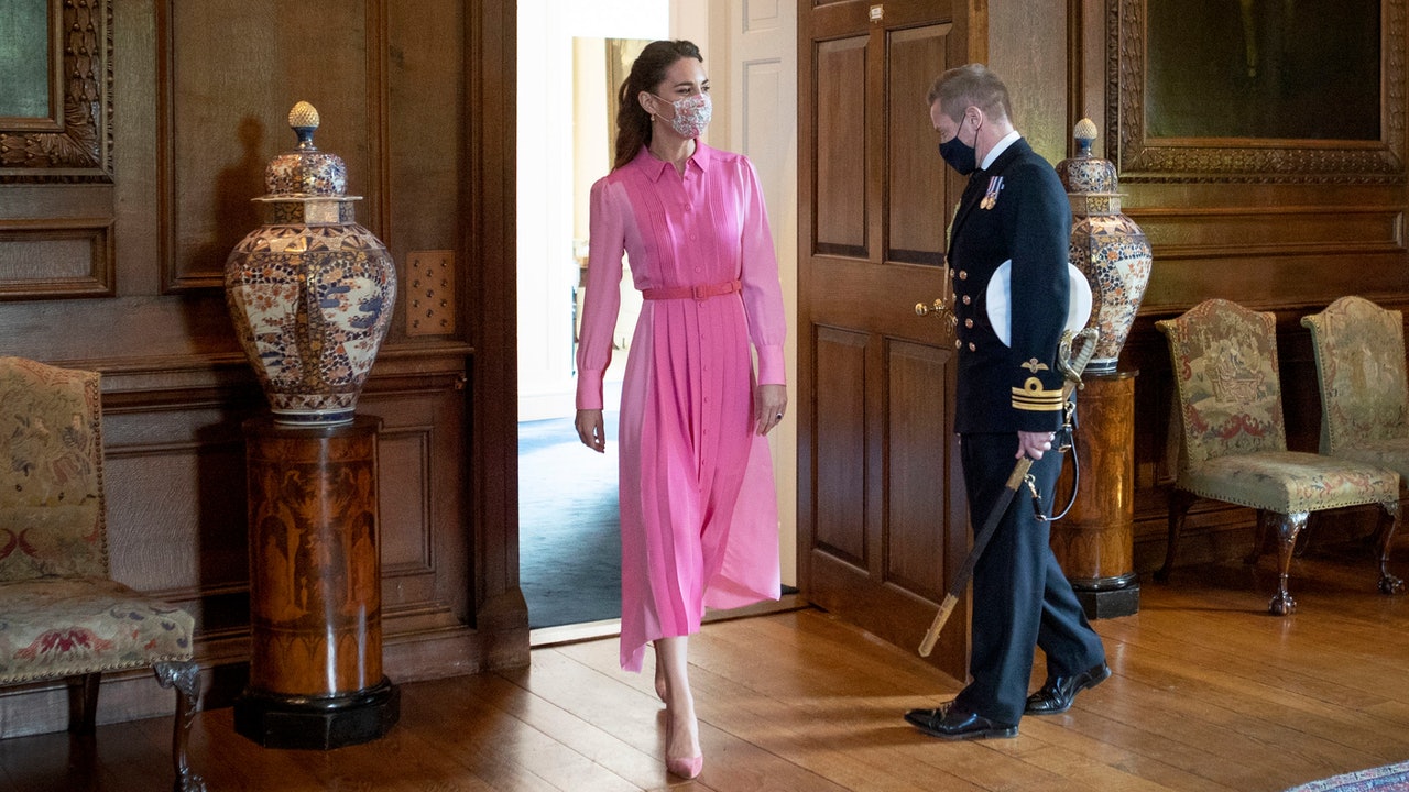 英國凱特王妃(Catherine, Duchess of Cambridge)5月27日在蘇格蘭霍利魯德宮(Palace of Holyroodhouse)接見患癌女童斯內登(Mila Sneddon)。凱特身穿粉紅色的連身裙、裝扮成「公主」的模樣,為的是兌現她與斯內登2020年的約定。