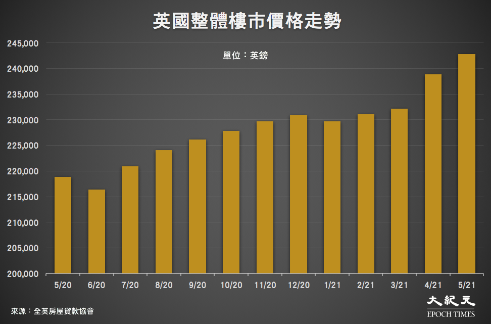 全英房屋貸款協會(Nationwide Building Society,NBS)昨天(1日)公佈最新英國多項樓市相關數據,5月份英國平均樓價錄得24.3萬英鎊,按月上升1.8%,按年則上升10.9%,高於市場預期的9.2%。