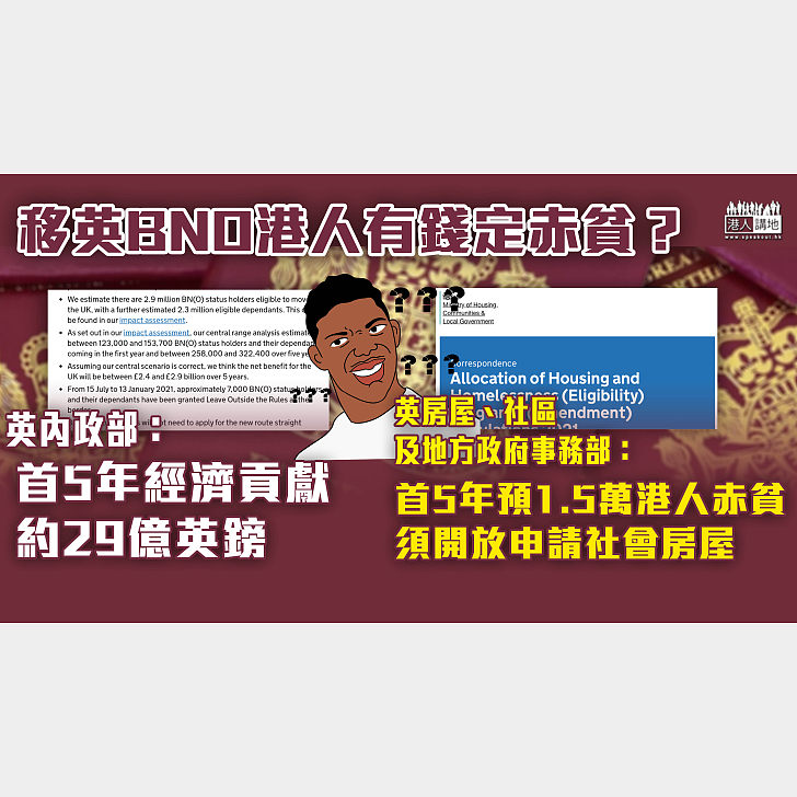 英國早前宣布修改移民規例,容許持英國國民(海外)護照(BNO)簽證赴英國居留的香港人,一旦經濟極度困難,可在提供充分證據的情況下申請公共資助。英國房屋社區及地方政府事務部(MHCLG)周四(10日)公布當局向地方政府講述新政策的信件,預料首5年會有2400人至1.5萬人受惠於相關措施。