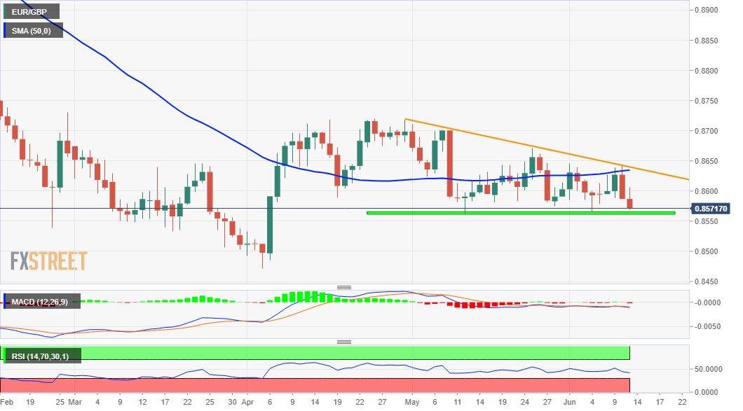 下一個相關支撐位在本月早些時候測試過的水平區域0.8560附近。這與上面提到的趨勢線一起,構成了日線圖上一個下降三角形。有效跌破該三角形態將為進一步的短期貶值奠定基礎。