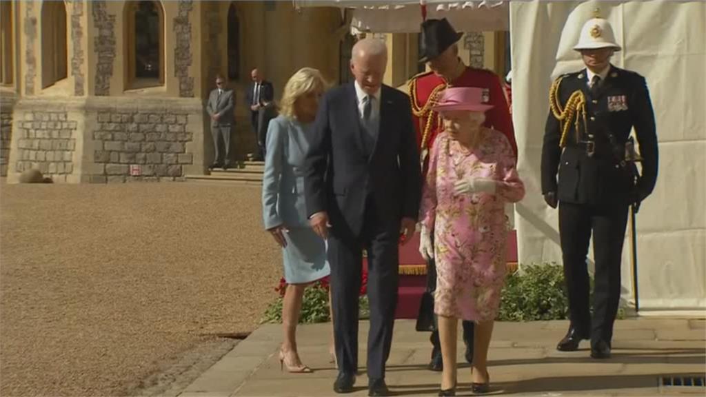 溫莎古堡前皇家樂儀隊列隊奏起英國國歌,迎接重要貴賓到來。結束G7峰會,美國拜登和第一夫人吉兒,馬上搭飛機走人,但不是去下一站比利時,而是飛往溫莎「再見」女王,拜登下場檢閱儀仗隊,在整個歡迎儀式結束時,拜登伸手想攙扶95歲的女王,不過女王婉拒,之後三人進入城堡喝了一小時的下午茶。