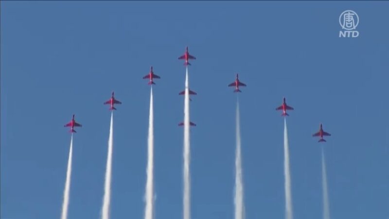 【新唐人北京時間2021年06月13日訊】週六(6 月 12 日),英國王室空軍特技飛行隊「紅箭」在康沃爾(Cornwall)海濱度假勝地卡比斯灣(Carbis Bay)上空舉行了精采的飛行表演,為G7峰會首腦助興。