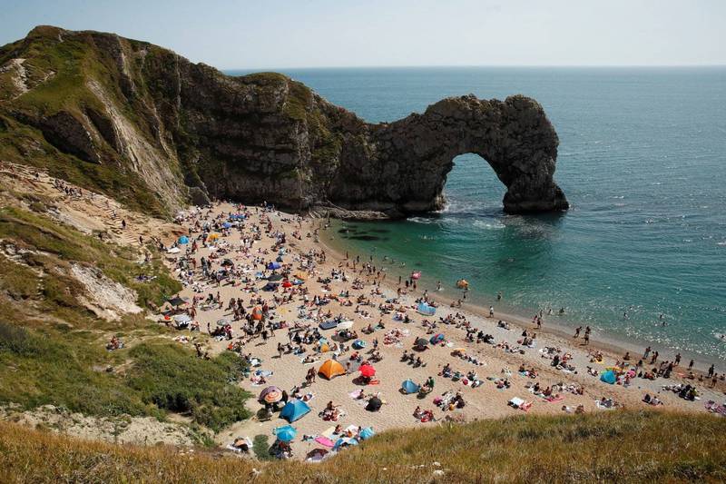 昨日有名女子在英國著名自然景點杜爾德門(Durdle Door)攀爬,不慎失足墜崖,當場死亡。(路透社)