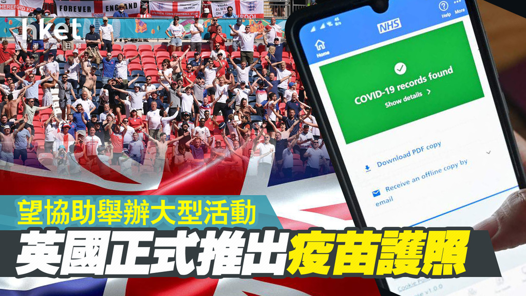 國民保健服務(NHS)周三正式推出手機應用程式「NHS Covid Pass」,民眾可透過程式出示疫苗接種記錄。尚未接種疫苗人士,亦可上載近期陰性檢測記錄,或6個月內康復證明。當局考慮將在熱門體育賽事中試行,包括溫布頓網球錦標賽及歐洲國家盃。
