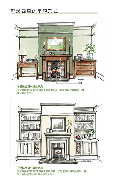 壁爐台上方會裝飾鏡子或繪畫,檯面上則會擺放各式小物、照片等個人喜愛的物品。壁爐空間附近的呈現方式,將會改變一個空間所帶給人的感覺。