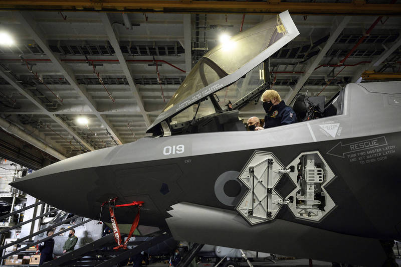 英國國防大臣華勒斯近日提出警告,英國增購F-35的計畫可能因故延宕。圖為英國首相強森登上F-35駕駛艙。(美聯社)