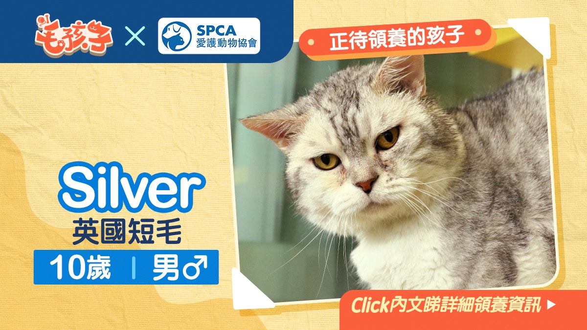 雖則長著一張厭世的樣子,但Silver卻是一隻非常友善親人的老貓伯伯。超級喜歡撒嬌的牠會不停的在你身邊蹭來蹭去;而當你蹲下去的時候,Silver更會跟你撞頭頭呢!但如果要說Silver最具代表性的地方就是牠有時候會擺出一副不屑的樣子:牠會咬著一邊的嘴角,看起來就像是鄙視你一樣!Silver不但有耳和皮膚上的病歷,而且年紀也比較大,故此需要長期食用特別處方糧。你願意給Silver一個家,讓牠的餘生都充滿愛嗎?