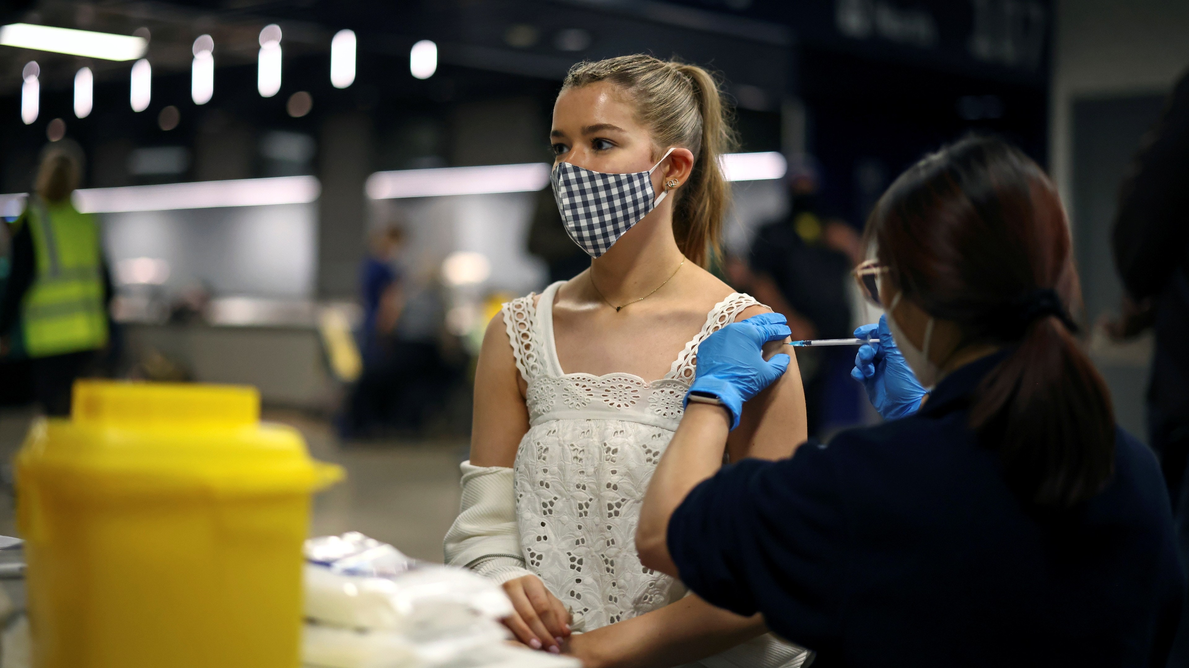 圖為6月20日,英國倫敦一間疫苗接種中心外排長龍,多人正等待接種疫苗。(Reuters)