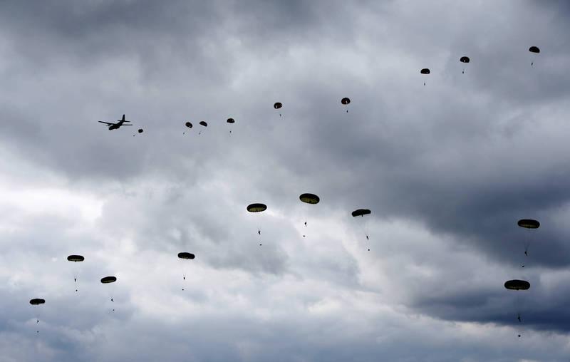 1名英國傘兵在加州進行訓練,因傘未完全張開,也偏離降落場,撞破民宅屋頂摔進室內。傘兵示意圖,與本新聞無關。(路透)