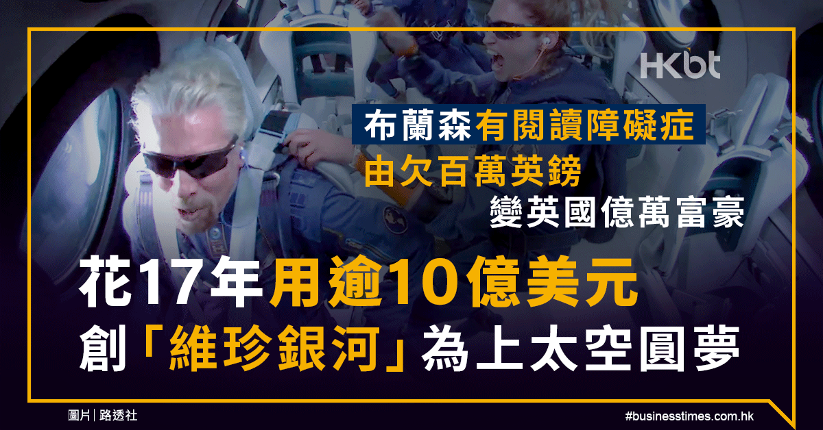 【維珍銀河|布蘭森】英國億萬富豪布蘭森(Richard Branson),於7月11日晚上乘坐維珍銀河(Virgin Galactic)的太空船升空,最後順利回程並降落。有見及此,他成為了第一位太空旅客,亦達成了從小上太空的夢想。但原來他從小患有嚴重的閱讀障礙症,到底他如何成為億萬富豪?