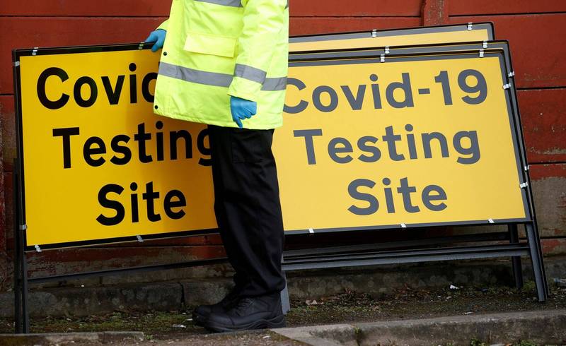 英國國民保健署(NHS)2月間設置的新冠病毒篩檢站指示牌。(路透檔案照)