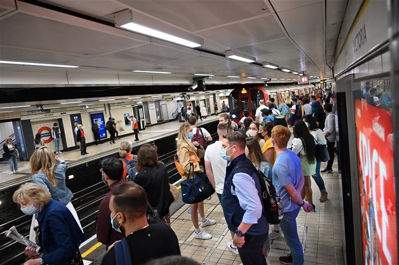 英國18日解封,科學家和在野黨痛批政府說,這一步等於是危險跳進未知境地。圖為乘客14日搭乘倫敦地鐵。(法新社)