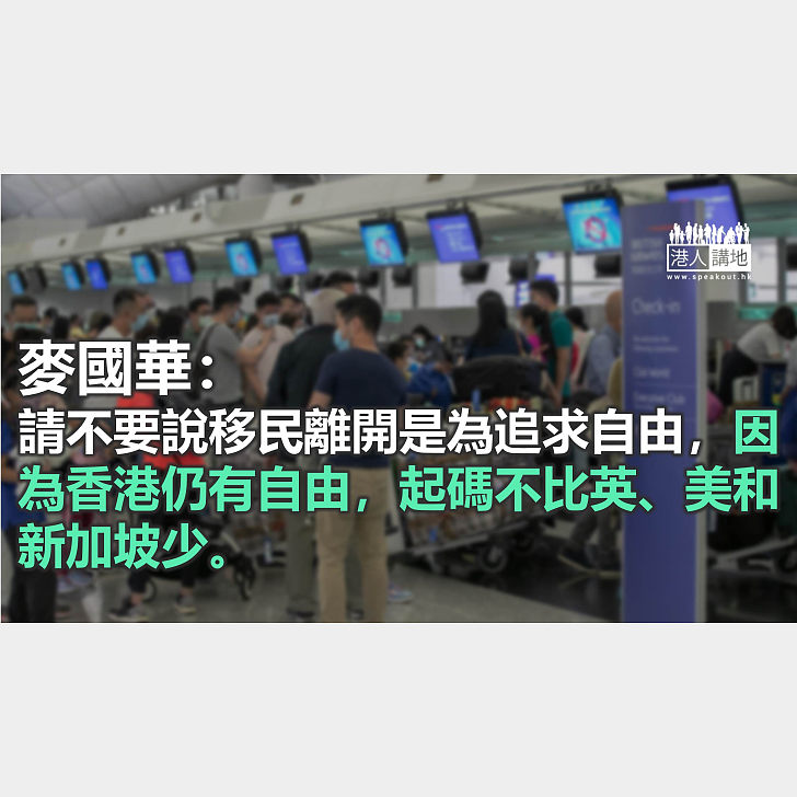 他們可以有100種理由要走:香港的樓價貴,生活指數高,環境擠迫,空氣污濁,貧富懸殊,教育質素不及外國,年輕人缺乏上進機會等等,香港全都可以接受。但請不要告訴香港,說這裏沒有自由而出走,因為這不是事實,除非他們指的是分裂國家、煽動獨立和勾結外力制裁香港的自由,以及打、砸、搶、燒的自由。