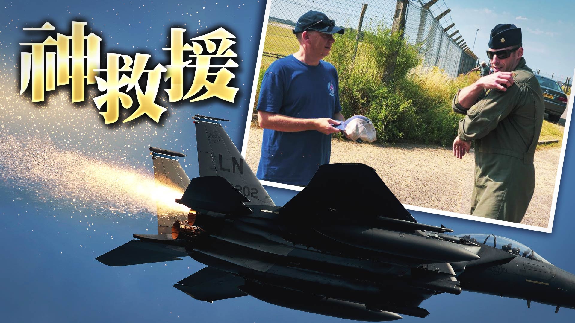 本月13日,56歲英國男子辛普森(Ian Simpson)和一群航空同好在英格蘭東部皇家空軍基地的圍欄外,拍攝戰鬥機起飛畫面。突然間,他們目賭一架F-15E攻擊鷹式戰鬥轟炸機的尾部持續冒出陣陣火花。他和同好收聽塔台通話內容,發現飛行員顯然並未察覺出問題。