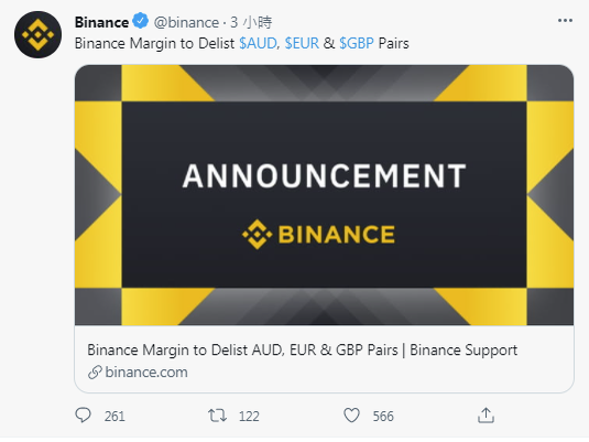 幣安宣佈,將停止對英鎊、澳元、歐元的加密保證金交易。(圖截取自推特)