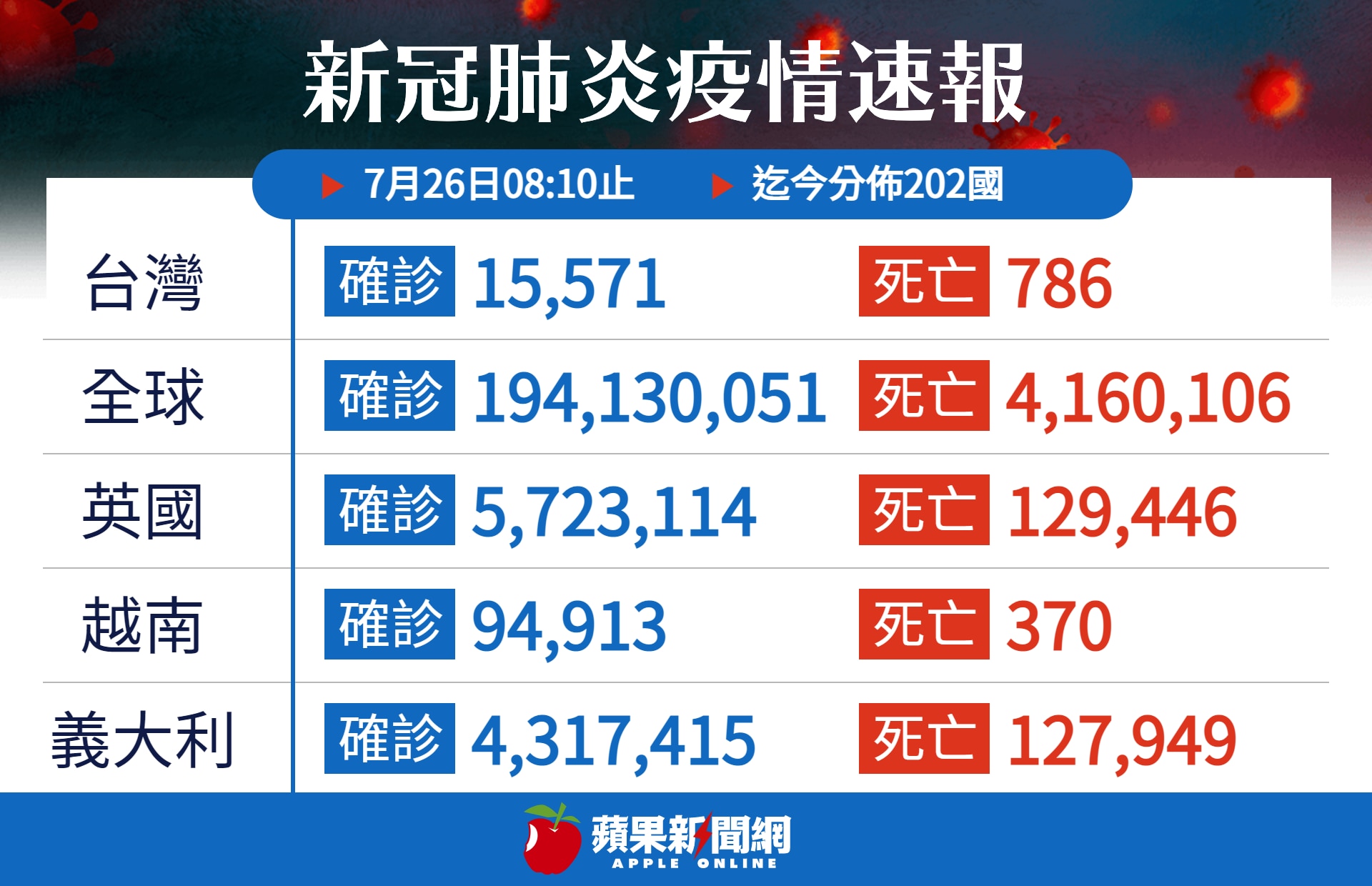 新型冠狀病毒肺炎(COVID-19)疫情於2019年底自中國武漢爆發後,延燒全球迄今(7/26)已造成超過1億9413萬人染疫,逾416萬人死亡。