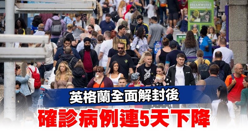 (倫敦26日綜合電)英國上周一在質疑聲中如期放寬英格蘭地區防疫措施,約翰遜政府的整體抗疫政策續受關注。統計數據顯示,英格蘭徹底解禁後,確診病例連續第5天下降。
