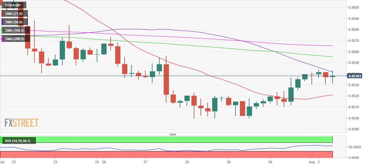歐元兌英鎊已經進入了關鍵的下降50週期簡單移動平均線(SMA)0.8541,這在過去幾個小時限制了歐元兌英鎊的上行嘗試,
