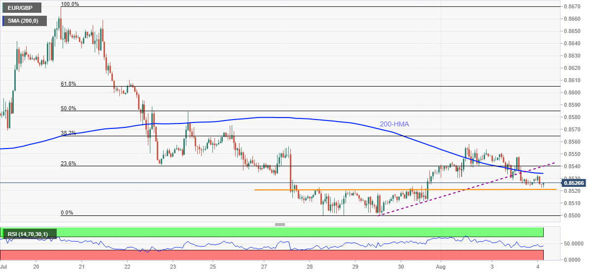週三歐洲時段開盤前,歐元兌英鎊依然承壓於0.8525附近。前一日該交叉盤跌破自7月29日以來的一條上行趨勢線和200小時均線。