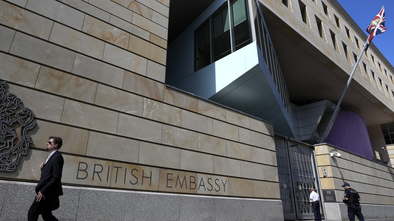 俄羅斯間諜:圖為8月11日,一輛警車停在英國駐德國柏林大使館前。(AP)