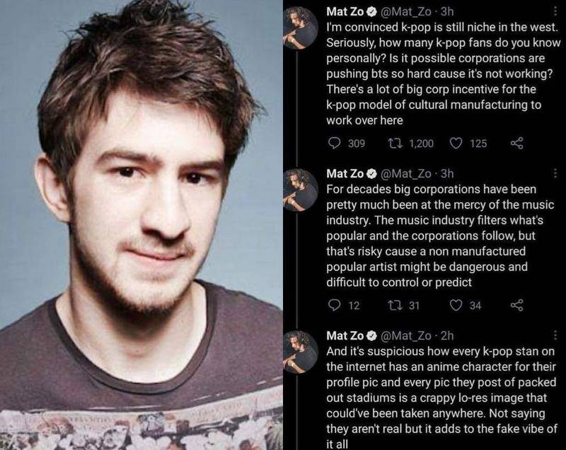 麥特祖海在推特表示,他始終相信K-POP音樂在西方國家仍是一個小眾市場:「說真的,你們周圍有多少個K-POP粉絲?」接著繼續批評:「公司是不是不賺錢,才把BTS推到全世界?一心想把在K-POP成功的模式複製到這裡(西方國家)。看到演唱會現場人滿為患,覺得很荒謬糟糕,雖然不能說不是真的,但加了一層假照片吧!」