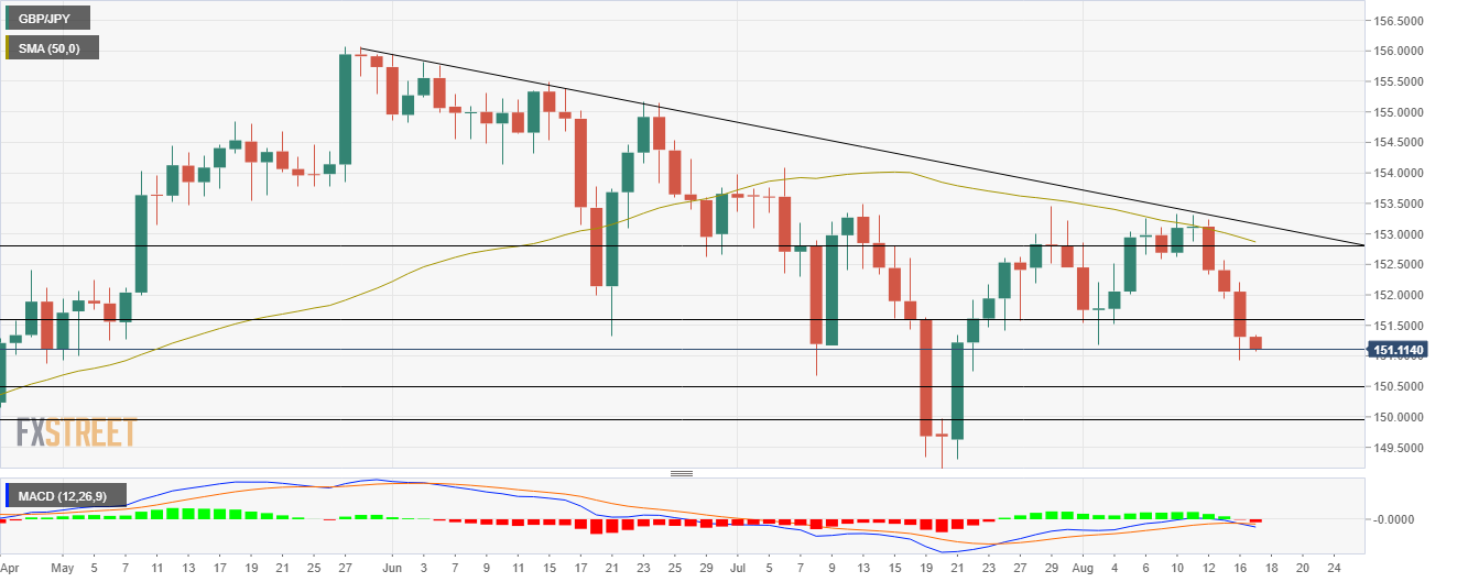 如果英鎊/日元跌破 151.00 附近的雙底形態,則將延續當前趨勢,150.50 水平支撐位成為下跌目標。