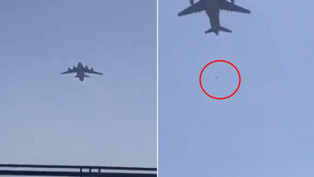 根據《BNO News》報導,一架飛機從喀布爾機場起飛時,有2名以上的乘客想逃離阿富汗,攀上美軍運輸機時,不幸從高空中落下,影片中有出現2個小黑點,不久後傳出至少有3人從飛機墜落死亡。