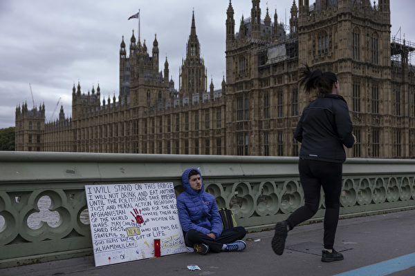2021年8月17日,英國倫敦,威斯敏斯特橋(Westminster Bridge)上一位市民靜坐抗議塔利班接管阿富汗。(Dan Kitwood/Getty Images)