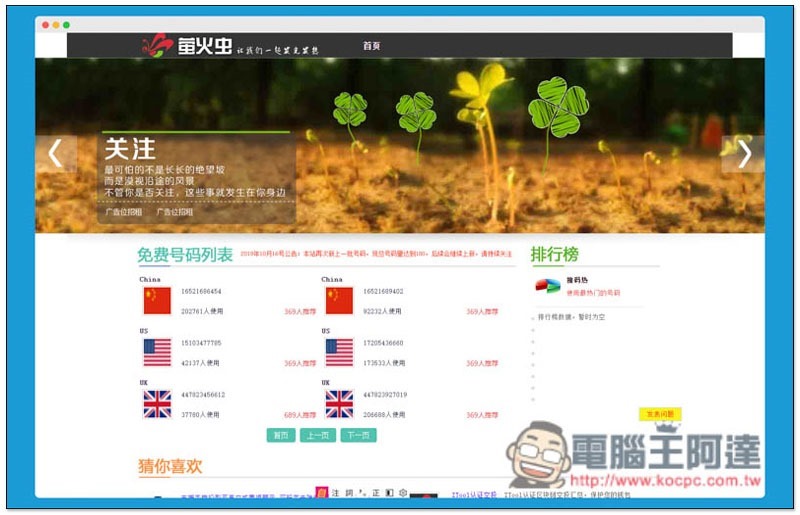 如下圖所示,這才是正常的網頁。首頁中間就會顯示所有免費號碼列表,每一個都會註明已經有多少使用、多少人推薦,對於那些熱門服務,我建議找少人用電話號碼: