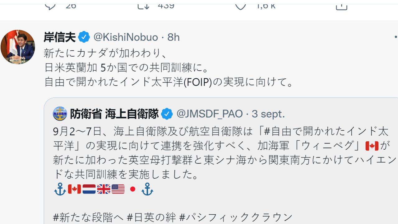 日本防衛大臣岸信夫今天9月4日發布推特說,加拿大也加入到日本自衛隊與美國英國荷蘭船艦聯合訓練的活動。“走向一個自由開放的印太”。