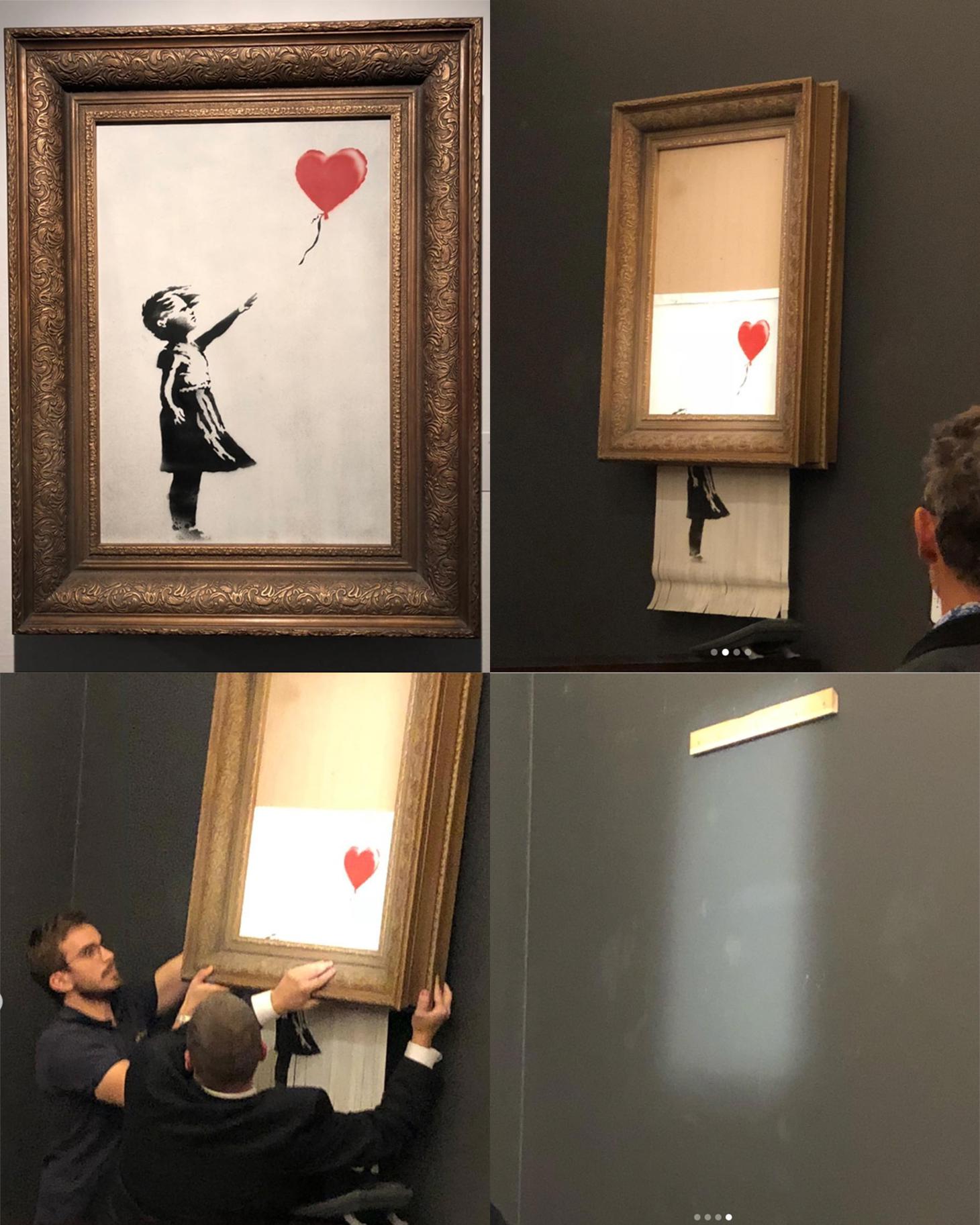 2018 年 10 月 5 日,Banksy 作品 Girl with Balloon 在倫敦蘇富比拍賣會拍出過千萬港元,但在拍賣鎚敲響後,畫框響起警報,眾目睽睽下,畫作被內藏的碎紙機破壞,成為全球熱話。幾日後,Banksy 宣布「已碎」畫作及畫框成為一份新作品 Love is in the Bin,最終由一名匿名歐洲女性藏家以 140 萬美元(約 1,166 萬港元)買下作品。