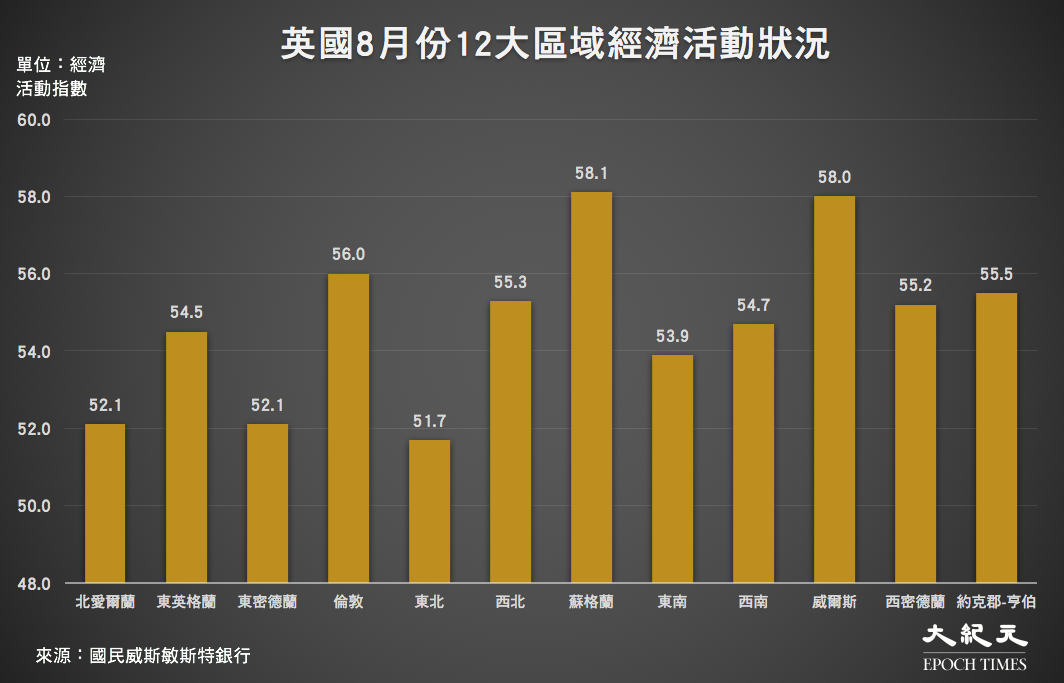 國民西敏寺銀行NatWest聯同財經數據服務公司IHS Markit於較早前公佈最新英國12個地區的綜合經濟活動指數(Composite Business Activity Index)數值,8月份表現最佳的為蘇格蘭地區,錄得58.1。50是分水嶺,50以上反映經濟擴張,50以下反映經濟收縮。
