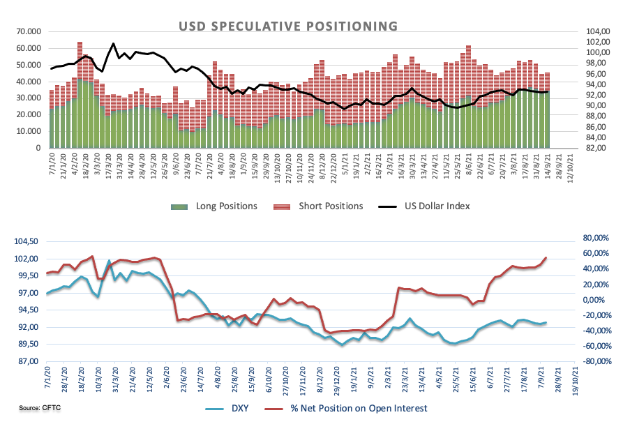 美元投機性多頭頭寸連續第四周增加,目前觸及2020年2月底的水平,接近新冠病毒疫情爆發。此外,美元的淨多頭與未平倉合約的比率逼近55%,這是2020年5月中旬的水平。上周美元指數陷入盤整模式,市場參與者消化最細的美國非農數據,而美聯儲發言人堅持要早於預期縮減量化寬鬆,美國收益率從頂部回落修正。