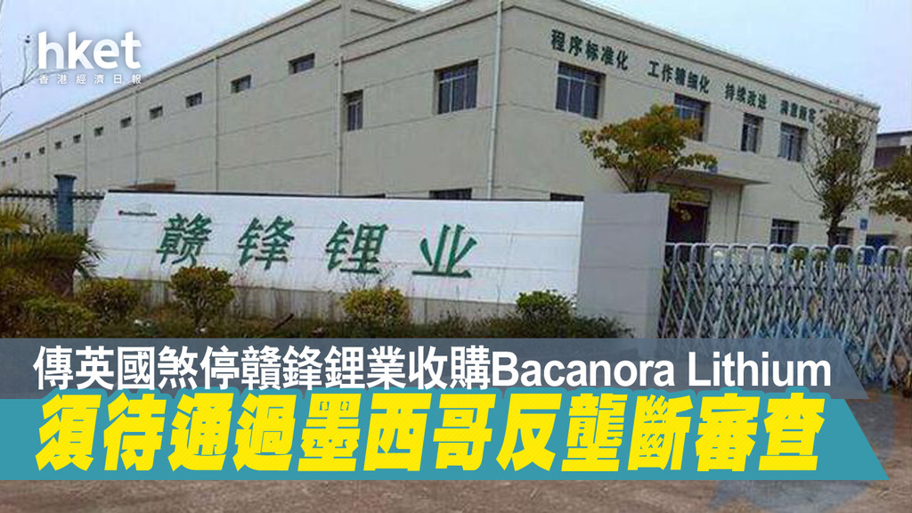 據外媒報道指,英國收購委員會已經暫停贛鋒鋰業 (01772) 旗下的全資子公司收購英國上市公司Bacanora Lithium PLC全部已發行股本,直至是次收購滿足墨西哥的反壟斷審查條件,或獲得有關機構的豁免。