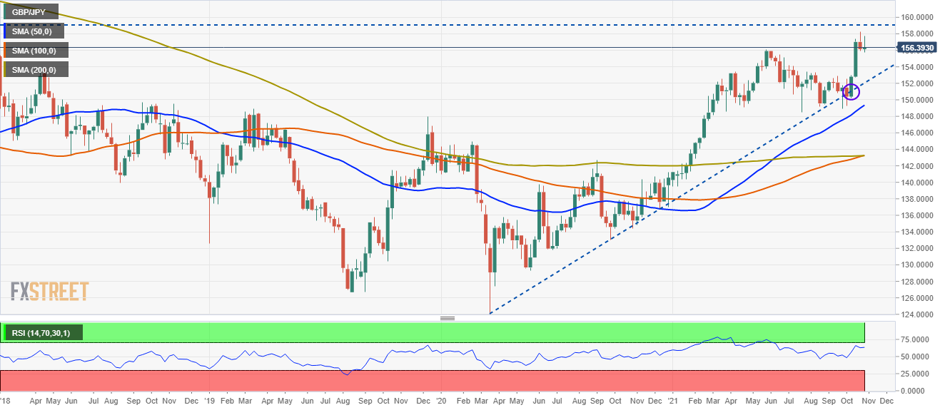 週圖顯示英鎊/日元處在穩固的上升趨勢中,週線均線處在現價下方,匯價測試 2018 年 2 月 2 日阻力位 156.61。自 7 月以來,匯價已上漲 6.50%,100-週均線 剛剛穿越 200-週均線,提出匯價將進一步看漲的信號。