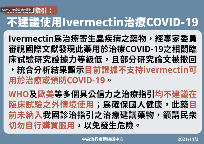 針對伊維菌素能治療COVID-19的說法,莊人祥特別說明,專家委員會不定期針對該藥進行評估,參考國內外文獻和臨床情況,目前證據並不支持用於治療或預防COVID-19,WHO治療指引也不建議採用。莊人祥強調,伊維菌素為治療寄生蟲疾病藥物,民眾目前若自行購買取得,均為動物用藥,請勿服用,避免發生危險。