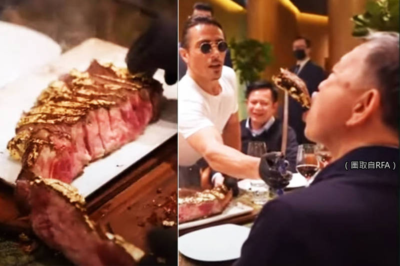 越南公安部長蘇林大啖要價1450英鎊的「黃金戰斧牛排」,讓越南網友炸鍋了。(圖取自RFA;本報合成)