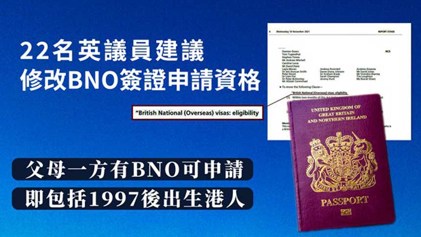 近日,共22位英國下議院議員共同建議,修改英國國民海外護照(BNO)簽證申請條款,提出港人只要父母中一方擁有BNO資格,即可申請BNO簽證到英國定居,包括1997年後出生的香港年輕人,該建議預計將於月底在英國下議院進行討論。