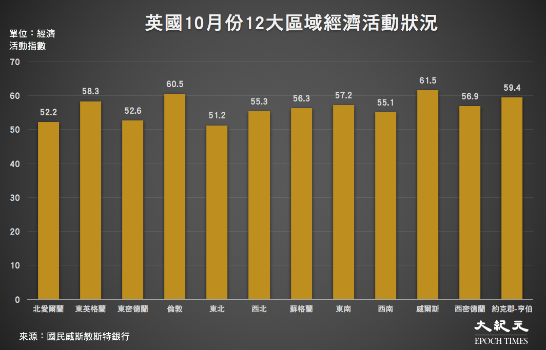 國民西敏寺銀行NatWest聯同財經數據服務公司IHS Markit於本周公布最新英國12個地區的綜合經濟活動指數(Composite Business Activity Index)數值,10月份表現最佳的為威爾斯地區,錄得61.5,連續兩個月跑贏。50是分水嶺,50以上反映經濟擴張,50以下反映經濟收縮。