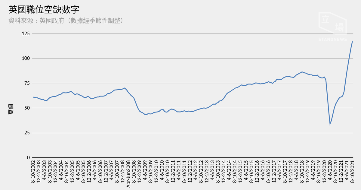 英國政府公布最新就業數據,反映解除封城後復甦持續。8 月至 10 月職位空缺錄得破紀錄的 117.2 萬個。每個空缺對應的失業人口數字為 1.3,是 1971 年以來最低,反映企業面對甚大招聘壓力。